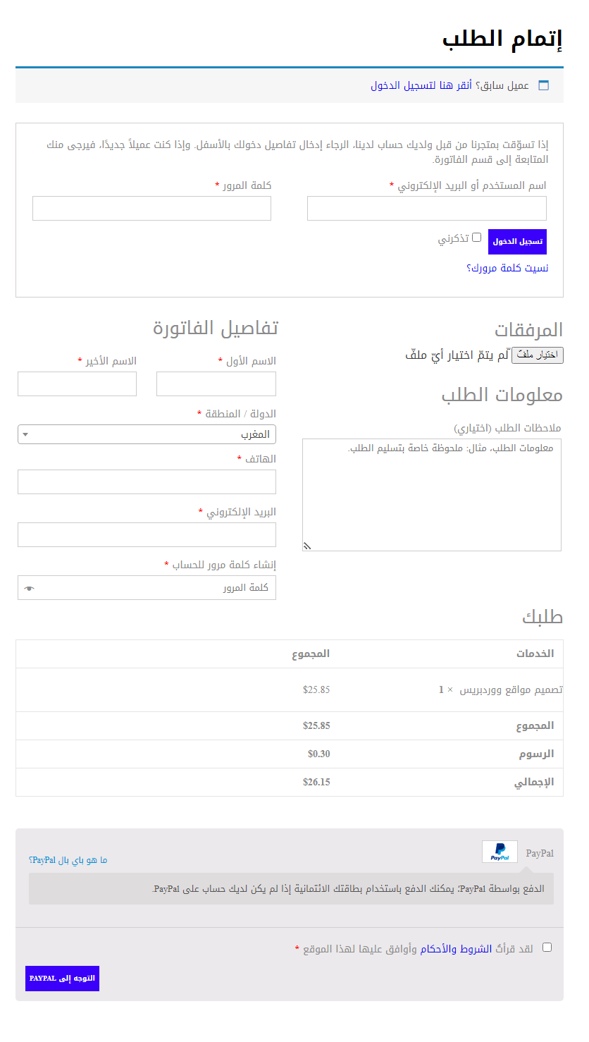 قم بإدخال معلومات الطلب (المنشورات/رابط ملف العمل…) وتفاصيل الفاتورة (الإسم الأول/الإسم الأخير/الدولة/المنطقة/الهاتف/البريد الإلكتروني/) واختر طريقة الدفع ووافق على الشروط والأحكام ثم اضغط على تأكيد الطلب لمتابعة طلبك: